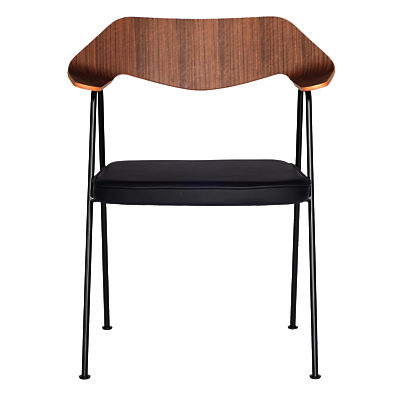 A design that has truly stood the test of time, this 675 chair is the authentic licensed production of the original 1952 design, endorsed by the Robin and Lucienne Day Foundation. The chair’s most prominent feature is its curved walnut-veneered plywood back. Pioneering at the time, Robin Day overcame the difficulty of forming a single moulded plywood chair with armrests by creating a bent shape using a singular curve rather than a double curve. In close collaboration with the Robin and Lucienne Day Foundation, Case has revised the dimensions of the chair, making the 2014 version slightly smaller and more compact - as it was originally designed to be. Finished with a walnut-veneered ply back, black powder-coated steel frame and black leather upholstered seat pad – in the words of Robin Day: ‘metal for strength and lightness ... wood for touch and appearance.’ The 675 is comfortable for long periods of use thanks to the large seat pad, and is equally at home in your office and dining space. .