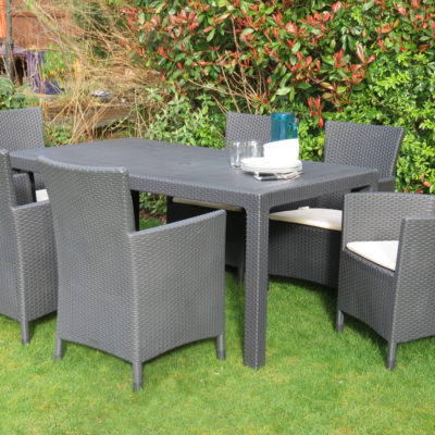 Allibert Melody 6-Seater Dining Set Dine al fresco with friends or enjoy a contemporary dining set for your conservatory with this 6-seater rattan effect dining set. With removable pads on the comfortable armchairs, a metal-free design and easy to clean material, this dining set is comfortable enough for indoors but won't rust or ruin outdoors. Materials: Polypropylene Table dimensions: H75 x W160.5 x D94.5cm Chair dimensions: H89 x W60 x D62cm Table weight: 14.4kg Chair weight x2: 13.6kg Colour: Graphite Seat pads included Self-assembly required: Yes
