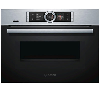 Explore fresh dimensions in cooking with the Bosch NG6764S6B built-in multifunction single oven. It not only combines a steam oven with a microwave, this appliance also offers conventional, convection and fan heating, as well as a grill. It has a touch-screen control panel, a huge number of recipe-specific programmes and wi-fi for smart connectivity, all in a sleek housing with a brushed steel trim. Total control This versatile oven offers 15 cooking methods and handful of additional functions. And it's all simple to use thanks to a touch-screen control panel with full text display that is programmed with countless dishes and ingredients. All you have to do is specify the weight of the ingredients and the oven automatically sets the optimal type of heat, temperature and time. Flexible options It incorporates a sensor for precision baking and close temperature control for perfect roasts. And it gives all kinds of options that produce the best results, for example, the microwave with steam function is ideal for reheating food. Other special modes of operation cater for proving dough, descaling fish and drying. Easy clean The oven also offers spotless cleaning at the touch of a button. Pyrolytic coatings on the oven's interior can withstand intense, high temperatures that practically vapourises food residues. The cleaning cycle burns deposits to ash, which can then be easily wiped away with a damp cloth. Cooking methods Hot air Hot air Eco Conventional top and bottom heat Conventional heat Eco Hotair grilling Full width variable grill Half-width grill Pizza function Bottom heat Intensive heat Low temperature cooking Plate warming Dehydrate Keep warm Microwave Combi microwave Microwave with steam