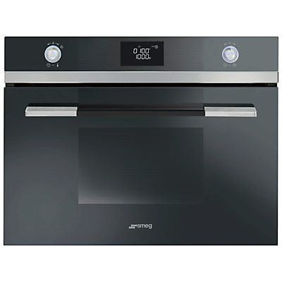 Elegant and stylish the Linea Aesthetic range from Smeg incorporates modern and minimalist design combined with advanced cooking functions and technology. Complete with a sleek black finish, the SMEG SF4120MCN Linea Aesthetic Combination Microwave Oven will be a useful addition to your kitchen. This compact combination microwave oven has a large 40L capacity, edge to edge cooking, 16 functions and 20 automatic programmes. Characterised by symmetrical lines, the Linea Aesthetic is ergonomically designed to maximise space whilst making a contemporary statement in your kitchen. Compact microwave oven If you're looking for all the benefits of combination cooking without compromising on worktop space, the SF4120MCN microwave combination oven will be ideal for your needs. As a combination oven, this appliance can be used as a microwave or as a traditional oven or alternatively the two methods can be combined. Circulaire This function combines with the fan to give a hot air cooking method, providing many benefits including 'no preheat' if cook time is more than 20 minutes, no flavour transfer when cooking different foods at the same time, less energy, and shorter cook times. Easy to clean Coated in enamel, this microwave is easy to clean and maintain, avoiding stubborn residue and grease. Defrost and grill Not only does this microwave oven have a handy grill function, it also automatically defrosts your food by weighing it before deciding on the time required for complete thawing. Smeg ovens include safe cook, which involves closed door grilling to keep cooking smells inside the oven and ensure a safe cooking environment. Ecological The combination of the grill, fan and lower element is particularly suitable for cooking small quantities of food, saving on energy and possibly helping to reduce running costs. Other features and functions: 20 versatile automatic programmes Easy to use LCD display Electronic timer with end of cooking alarm Triple glazed removable door 3 cooking levels with metal side supports Air cooling system Rapid pre-heating Closed door grilling Tilting grill