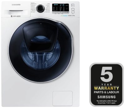 The Samsung WD80K5410OW comes with a Five Year Parts and Labour Warranty. Samsungs ecobubble; technology creates bubbles that penetrate your clothes faster so you can run cooler washes. Open the innovative AddWash; door to drop in anything extra during the wash. And, add a 30 minute bubble soak to any program to loosen tough stains. EcoBubble: Your Samsung washing machine helps you save a huge amount of energy by washing large loads at low temperatures using its ecobubble; technology. AddWash lets you simply and quickly add extra laundry into your machine after your wash has already started. It also allows you to easily pop in hand-washed clothes that you just want to rinse or spin dry. Bubble Soak: With the simple touch of a button Bubble Soak technology helps to remove a wide variety of stubborn stains. Overview: Condenser dryer. 8kg maximum washing capacity. 6kg maximum drying capacity. Size H85, W60, D60cm. Variable washing temperature. Variable spin speed. Child lock. Washing programmes: Baby. Cotton. Economy. Automatic half load. Intensive. Pre-wash option. 15 minute quick wash. Independent spin. Sports. Synthetics. Wool. Controls: Dial control. LED display. 19 hours delayed start. Time remaining indicator. Drying features: 5 dryness levels. Performance: Energy efficiency rating: A. Maximum spin speed 1400. Estimated annual energy consumption: 1088kWh/year. Estimated annual water consumption: 17600litres/year. Washing performance rating: A. Spinning performance rating: A. Washing noise level 54dB(A). Spinning noise level 73dB(A). Drying noise level 62dB(A). General features: Cold water fill. Pause facility. 72kg.