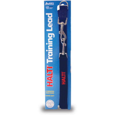 The Halti Training Lead is a multifunctional lead designed by Roger Mugford to simplify dog training and provide optimum control. Containing a range of different features you wont find any other training lead like this one on the market. Features: • Easily alters length for different types of training – Short length allows for heel training or normal walking, medium length for obedience training and long length for recall or distance work. • Hands free dog training. • The double-ended trigger hook allows for two dogs to be on one lead! • Double steering for optimum Halti control on head collars or harnesses. • Easy, Supervised tethering. • Made with soft, padded webbing for extra comfort. • The large and small size leads are both two meters long and come with a free training guide! • Recommended for use by canine professionals globally. Size Guide: Small: width = 15mm. Large: width = 25mm.